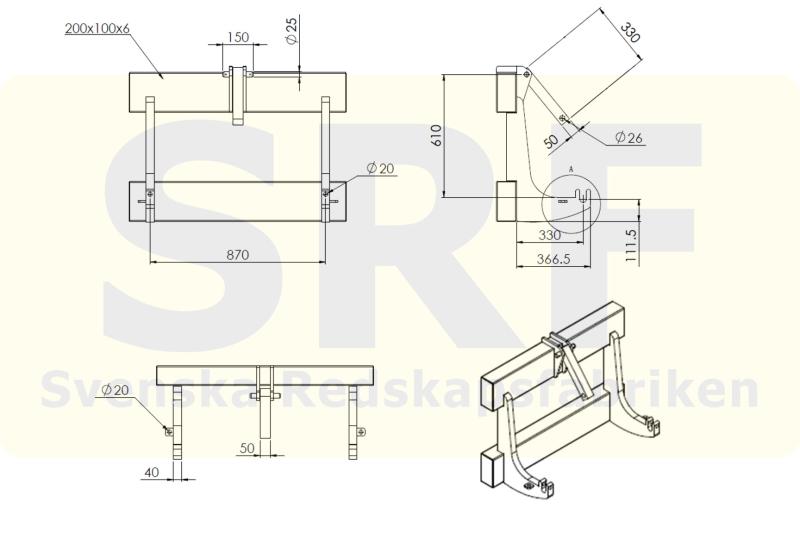 Utan fäste till redskap med 3 punktsfäste (kategori 2).